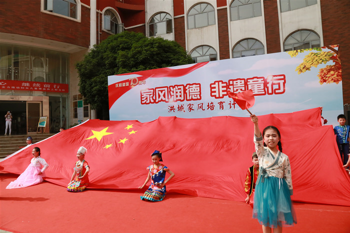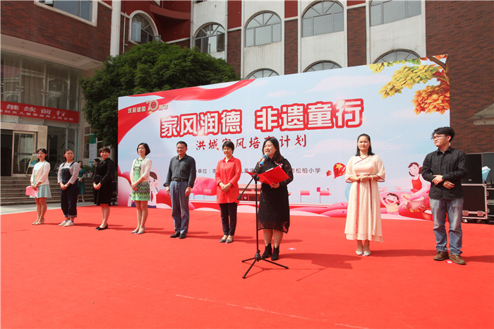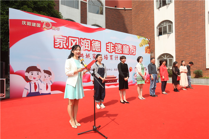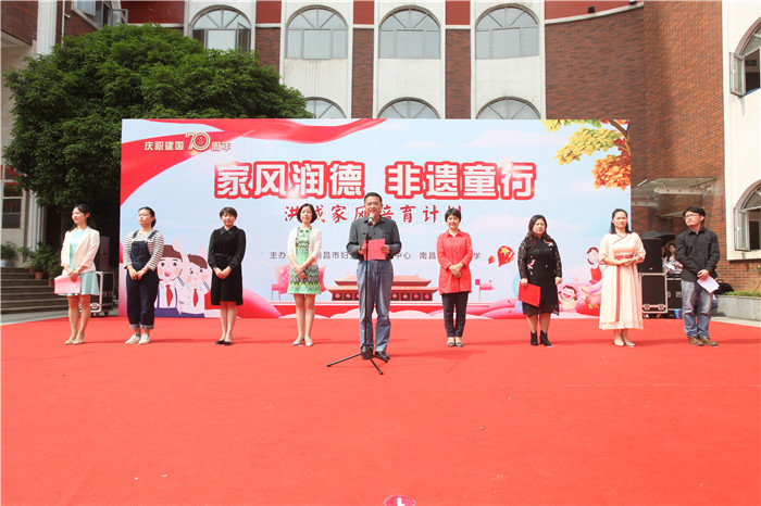 为热烈庆祝中华人民共和国成立70周年,深入践行习近平总书记关于家庭家教家风的重要论述精神,进一步落细落实市妇联“幸福家庭成长计划”,4月26日下午,市妇联、市妇女儿童活动中心“家风润德·非遗童行”洪城家风培育计划启动仪式隆重举行。市妇联副调研员吴建华,市妇联家儿部部长刘琛,市妇女儿童活动中心主任李茂,西湖区教体局副局长余从晖,西湖区妇联副主席范翠兰、市松柏学校教育集团书记谢小怡、北京巧手文化交流中心主任张陆阳以及豫章剪纸非物质文化代表性传承人沈哲、崛美行动等相关合作机构负责出席,松柏小学200余名师生、家长及市民群众参加了活动。